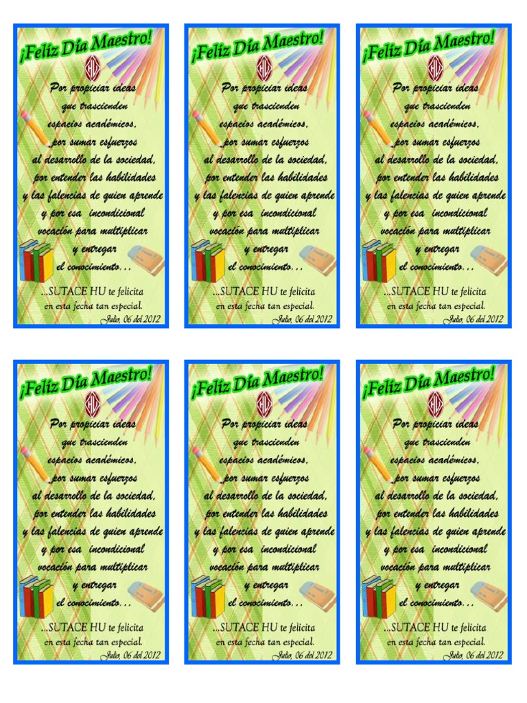 Dedícales una de estas lindas imagenes del dia del maestro, que tienen una variedad de frases para que puedas expresar todo tu cariño, aprecio y agradecimiento por todo el conocimiento que te brindaron y por todos los buenos consejos que te ayudarán a ser una persona de bien. 2 hermosas imágenes con mensajes de felíz día del maestro para compartir en redes sociales. Los niños pequeños pueden hacer una tarjeta casera para su maestro. Este sábado 15 de mayo se celebra el día del maestro, una festividad en la cual se conmemora a las personas que dedican su vida a enseñar. Su aniversario de muerte fue declarado como día de los maestros en la década de 1940 para honrar su.